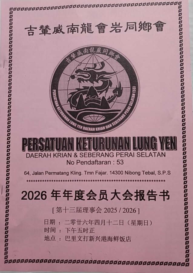 本同乡会定于下列日期、时间、地点召开第13届(2025/2026年)年度会员大会,届时敬请各乡亲会员们踊跃出席。